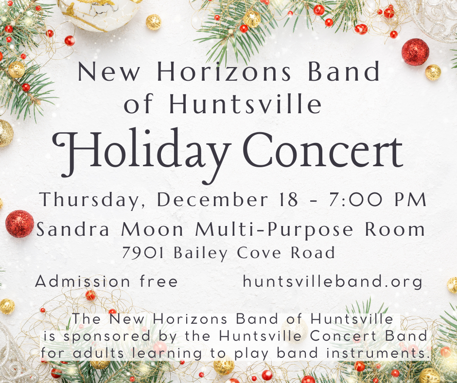 Initial funding for the New Horizons Band of Huntsville was provided by a grant from the New Horizons International Music Association.